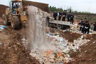 隨后,記者跟隨工作人員來到農安縣的無公害處理中心集中處理站,在這里這些不合格食品將被裝入鏟車,倒入集中處理點進行處理。