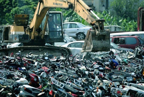 著現場的一聲令下,挖掘機的鐵臂將一輛輛二輪摩托車搗毀……岳麓區交警大隊處罰中隊中隊長雷越介紹:“比較普遍的違法行為是車輛無牌無證、未年檢,以及臨近報廢的情況。”除報廢車以外的其他車輛,違法當事人在車輛被扣留后要在規定的時間內到公安機關交通管理部門進行處理。此外,根據相關規定,公安機關交通管理部門對扣留的拼裝或者已達到報廢標準的機動車,經縣級以上公安機關交通管理部門批準后,予以收繳,強制報廢。雷越說:“報廢車,即超出車輛使用年限仍然在路上行駛的車輛,被依法扣留后,就要進行銷毀處理。”
