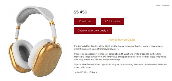 新款鍍金版蘋果AirPods Max頭戴式耳機(jī)配件由24克拉鍍金和白色鱷魚皮制成。耳罩采用24克拉鍍金,耳帶采用白色鱷魚皮,上面附有24克拉鍍金的戒指。Caviar表示,這款耳機(jī)對于“那些珍視自己的獨(dú)特性并希望始終居于首位的人而言”,是一款創(chuàng)新而出色的設(shè)備。它看起來十分優(yōu)雅,強(qiáng)調(diào)了佩戴者的地位和“無可挑剔的品味”。AirPods Max鍍金版限量99個,售價5450美元(折合人民幣約3.5萬元)。